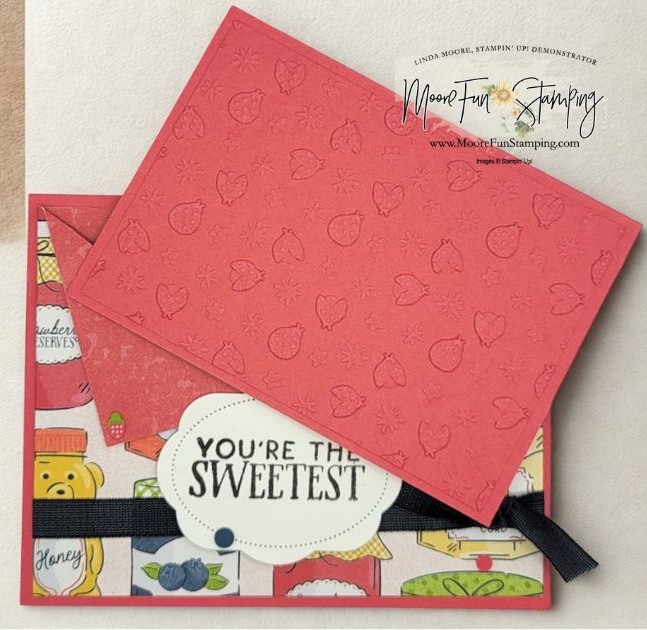 Here is what the card looks like. I embossed a piece of Strawberry Slush card stock with the Ladybug Picnic 3D Embossing Folder.