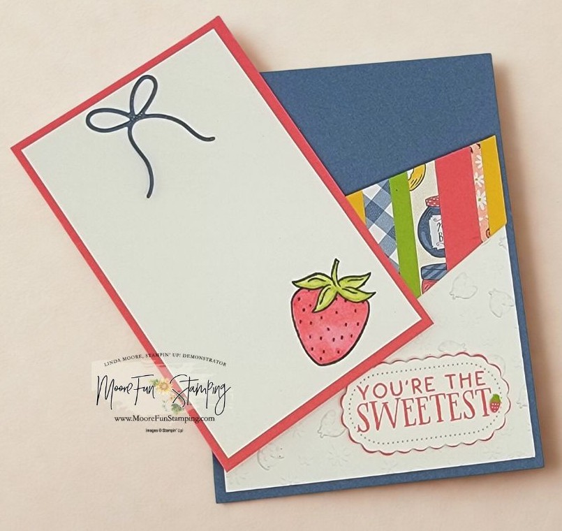 Here’s the pull-out section of the card. I used Strawberry Slush and Basic White cardstock. I stamped the strawberry in Tuxedo Memento Ink and colored it with Granny Apple Green and Strawberry Slush Combo Stampin’ Blends. The bling is the Strawberries & Dots Embellishments.
